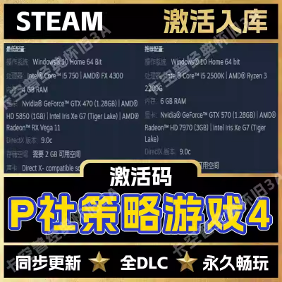 首页 > 限时特惠 > Steam激活 P社策略游戏4 国区全DLC 本体CDK激活码 24小时发货